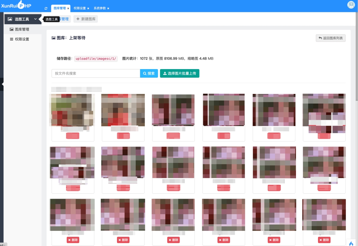 管理图库里的图:进入某个图库后,可以按文件名搜索、批量上传新图、删除某张图;支持翻页和「加载更多」,搜索不会整页刷新。