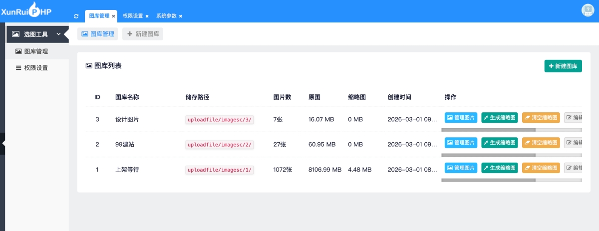 后端为 xunruicms 插件,提供图库管理、缩略图生成与访问控制。