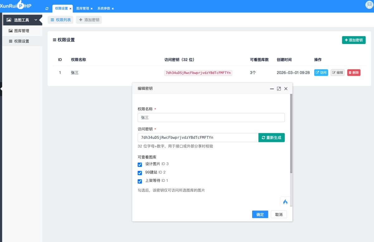 分配谁看哪个图库:在「权限/角色」里生成访问密钥,并勾选该密钥能访问哪些图库;把「访问地址」(带该密钥的链接)发给对应的人,对方用这个链接就能看到你允许的图库。