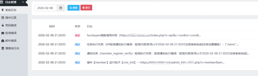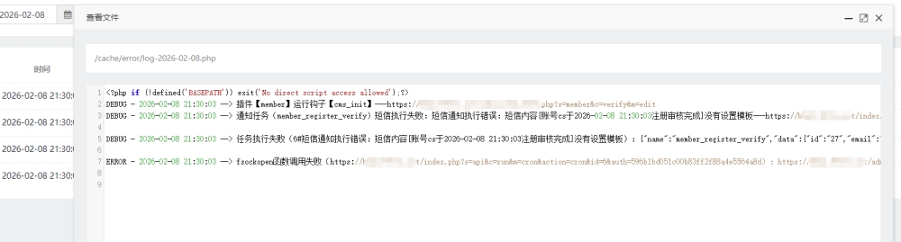 下面是阿里短信模板下面是日志报错:短信执行失败:短信通知执行错误:短信内容[账号cs于2026-02-08 21:30:03注册审核完成]没有设置模板,这个提示是指哪里没有设置模板?系统默认模板文件中的模板内容【账号{$username}于{dr_date($sys_time)}注册审核完成】不符合阿里变量规则,应该怎么修改?